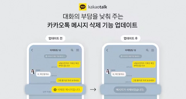 이번 업데이트에서는 메시지 삭제 표기 방식도 바뀌었는데요. 기존에는 삭제 시 발신자의 말풍선에 삭제자 정보가 함께 표시돼 삭제한 사람이 누구인지 확인할 수 있었죠. 앞으로는 삭제된 메시지에 “메시지가 삭제되었습니다”라는 문구만 표시돼, 누가 삭제했는지 알 수 없게 돼요.🤔 해당 변경 사항은 모바일과 PC 모두에 순차적으로 적용될 예정이라고 해요.