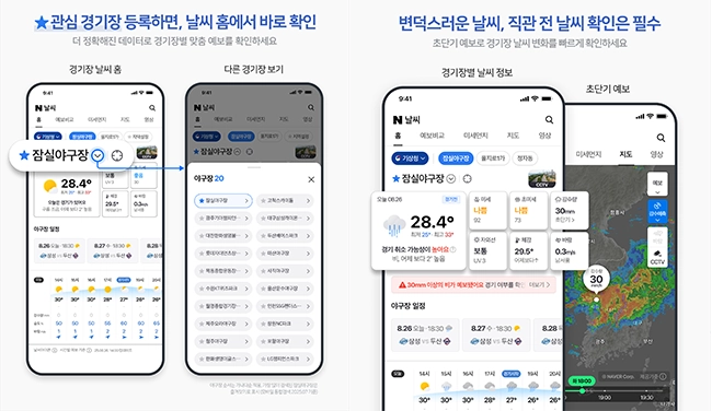 지난달 네이버가 전국 야구장의 정확한 날씨를 확인할 수 있는 ‘야구장 테마’ 서비스를 출시했어요. 구장별 위도와 경도에 맞춰 정밀한 ⛅날씨 정보를 제공한다는 건데요. 그동안 야구장 주변 날씨를 확인하고 싶으면 서울 송파구 잠실동, 부산 동래구 사직동 등 행정동 중심으로 날씨를 설정해야 했죠. 하지만 네이버 날씨에서 자주 가거나 원하는 야구장을 ‘관심 지역’으로 등록하면 구장별 날씨를 정확히 확인 할 수 있어요.