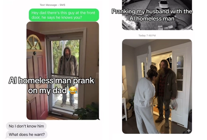최근 SNS를 중심으로 ‘AI 낯선 사람 장난(AI Homless Prank)’ 콘텐츠가 확산하고 있어요. AI를 활용해 낯선 남성이 소파에 앉아 있거나 🛏️침대에 누워 있는 모습의 사진을 만들고, ‘집에 누가 들어왔는데 어떻게 해야 하죠?’라는 메시지와 함께 가족이나 지인에게 📩전송하는데요. 이후 상대방의 놀란 반응을 캡처해 공유하는 거예요.