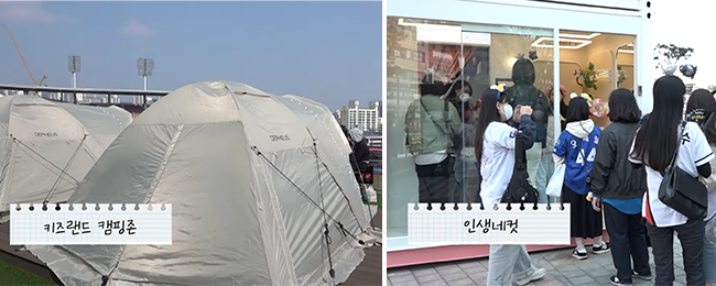 이렇듯 한국 프로야구는 야구장에서 즐길 거리를 만들어 MZ세대를 야구장으로 불러들이는 것이 가장 큰 과제로 남았는데요. 이에 일본에서는 야구를 좋아하지 않는 사람도 즐길 수 있는 동기를 만들기 위해 내년 3월, 사우나를 설치한 야구장을 개장한다고 해서 화제가 됐어요. 우리나라 또한 예전 인기를 회복하기 위해 다양한 시도를 하고 있는데요. 최근, kt 위즈는 캠핑하면서 야구를 볼 수 있도록 야구장 안에 캠핑존을 만들기도 했고요. K-POP 아카데미와 셀프카메라 스튜디오 등의 편의 시설을 만들기도 했답니다.