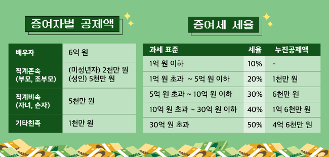 *누진공제액 : 각 소득 구간에서 산정되는 세율이 다르기 때문에 낮은 세율 구간에서 빠지는 금액을 미리 계산해 놓은 것. 증여세 = (증여재산-증여재산공제)x세율-누진공제액