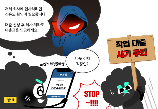 최근 인터넷 공고 글을 통해 지원한 회사에서 연락이 온 그런지의 친구, 먼지 사원!(먼지talk 참고) 오랜 취업준비생의 생활을 접고 드디어 취업 성공?!🤩 그런데 입사를 하려면 대출이 필요하다는데… 여기서 잠깐~!🤚 회사가 대출을 요구한다? 이게 바로 대출 사기예요! 취업난이 심한 요즘, 취업이 간절🙏한 청년 구직자들을 대상으로 대출 사기가 일어나고 있대요!
