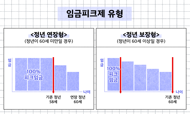 임금피크제 유형에는 크게 1) 기존 정년이 60세 미만이었던 기업이 정년을 60세로 연장하는 조건으로 정년 이전부터 임금을 줄이는 정년 연장형, 2) 정년이 60세 이상인 기업이 정년을 보장하되 정년 이전 일정 시점부터 임금을 줄이는 정년 보장형이 있고요, 3) 정년퇴직 이후에 이전보다 낮은 임금의 계약직으로 재고용하는 고용 연장형 등이 있어요.