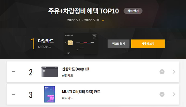 기름값 아끼는 데엔 역시 주유 할인 혜택을 해주는 신용카드💳가 필수죠! 특히 최근 들어 적립 형태보다는 ‘일정 할인율’을 제공하는 주유 카드를 찾는 사람들이 늘고 있다는데요, 국내 최대 신용카드 플랫폼인 ‘카드고릴라’에서 지난 5월 한달 간 집계한 ‘주유+차량정비 혜택 TOP 10‘ 차트 중 TOP 3을 소개해드릴게요.