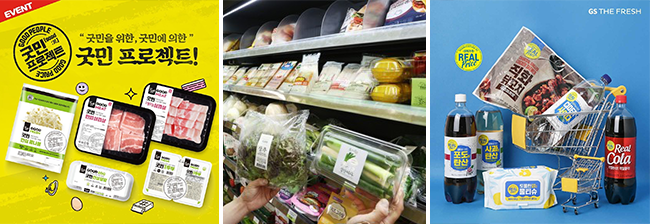 CU에선 마늘, 고추, 대파부터 모둠 쌈, 양배추, 감자 등 한국인들이 즐겨 찾는 채소 15종을 1~2끼 양으로 소분해서 판매하는 소포장 채소 시리즈 ‘싱싱생생‘🥦을 출시했고요, 세븐일레븐에서는 초저가 상품 브랜드 ‘굿민’👍을 론칭, 대형마트와 비슷한 가격대로 달걀, 삼겹살, 대패삼겹살, 두부, 콩나물 등 5종을 출시했어요. 그리고 7월 한달을 ‘물가 잡는 알뜰 장보기’라는 컨셉으로 특정 카드💳로 결제 시 반값 할인을 하기도 한다고. 또 GS더프레쉬에서는 타올, 위생 팩 등 생필품을 일반 상품 가격 대비 70~80% 할인된 가격으로 판매하고 있는데요, ‘리얼프라이스’🧻라는 자체 브랜드로 중소기업과 협업해 공산품을 초저가에 내놓는 거라고 해요.