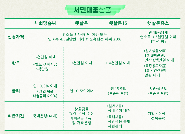대표적으로 새희망홀씨와 햇살론, 햇살론15, 햇살론유스🌱🌞 등 4가지가 있고요, 최대 3천만 원까지 대출받을 수 있어요. 연 소득, 신용평점, 연령에 따라 적용되는 대출한도와 금리가 각각 다른데요, 본인에게 맞는 상품은 금융감독원(☎1332), 서민금융진흥원 서민금융통합콜센터(☎1397), 그리고 맞춤대출 홈페이지에서 확인할 수 있어요!