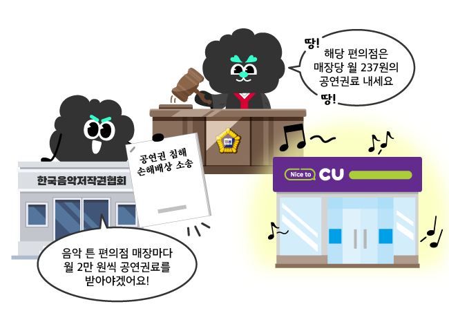 지난 2020년 1월, 한국음악저작권협회(음저협)가 편의점 CU의 운영사인 BGF리테일을 상대로 편의점 매장에서 음원을 틀어 공연권을 침해💥했다면서 매장 한 곳당 월 2만 원의 공연권 사용료를 내라는 소송을 냈어요. 여기서 ‘공연권’이란 저작권 중 하나로, 저작자가 저작물을 공중에 공개할 수 있는 권리를 말해요. 즉, 여러 사람 앞에서 연주🎷하거나 음원을 재생🔊하는 것까지 공연에 속하며, 타인이 창작한 음악을 틀기 위해선 그에 해당하는 권리 비용을 지급해야 한다는 거죠.💰