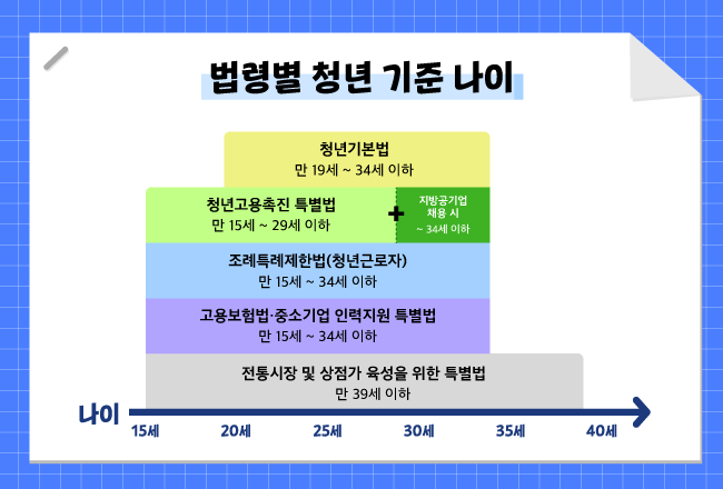 또한, ‘청년고용촉진 특별법’은 기본적으로 청년을 만 15세 이상부터 29세 이하로 보고 있는데요, 이 법에 따라 의무적으로 공공기관과 지방 공기업이 청년을 고용할 때는 그 범위가 만 34세까지 늘어난다고 해요. 그리고 전통시장 및 상점가 육성을 위한 특별법에 따르면 만 39세까지 ‘청년 상인’으로 인정한대요. 이밖에 지역에 따라서도 지자체 청년 지원 사업 대상의 청년 기준이 다르다고 해요.