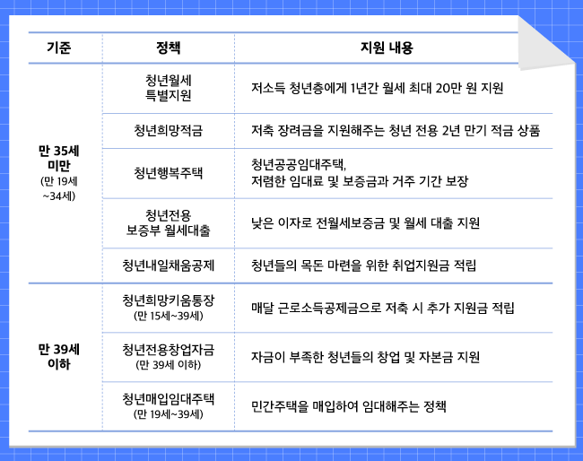 정부와 지자체에서 지원해주는 청년 정책을 살펴보면요, 만 19세~ 34세 기준으로 청년들에게 혜택을 주는 제도는 청년월세 특별지원, 청년희망적금, 청년행복주택 등이 있고요, 청년희망키움통장, 청년전용창업자금 등 좀 더 범위를 확대해 만 39세까지 청년으로 보고 지원해주는 정책도 있어요.