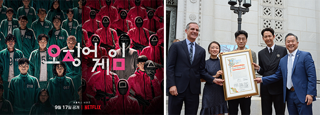 〈오징어게임〉 포스터와 LA 시의회에서 9월 17일을 ‘오징어게임의 날’로 제정 후 찍은 사진 / 출처 : 넷플릭스