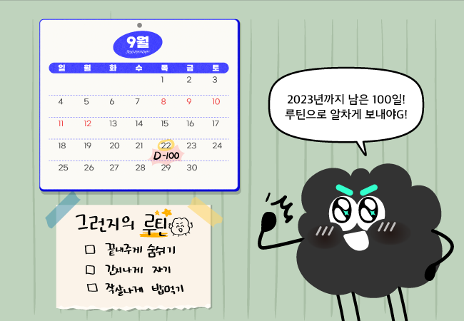 하지만 사원님들, 가장 중요한 것은 무언가를 꼭 이뤄내야 한다는 강박에 시달리지 않는 거겠죠?😢 루틴을 지키지 못하더라도 우리 남은 100일을 행복하게 잘 마무리하자고요!😊