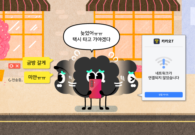 지난주 토요일 그런지 사원은 친구와 약속에 한 시간이나 늦어버렸대요. 카카오T 앱이 먹통이 돼서 🚖택시를 잡을 수 없었기 때문인데요. 심지어 카카오톡까지 오류가 생겨 친구에게 연락도 바로 하지 못했다고. (그런지 : 친구야~ 미안😭)