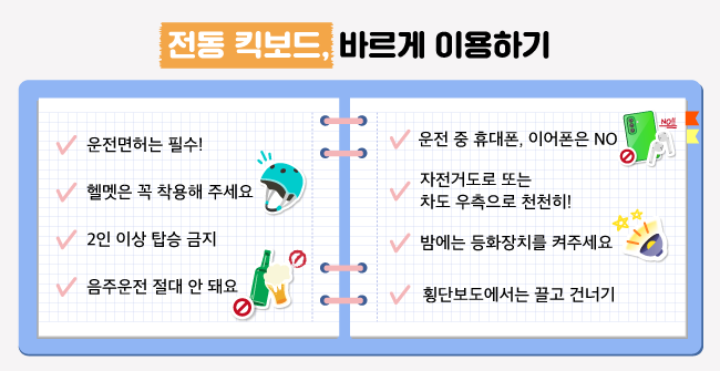 길을 가다 보면 헬멧을 쓰지 않고 전동 킥보드를 타거나, 2명 이상이 함께 타는 경우도 자주 보이는데요. 이렇게 킥보드를 타는 행위는 ❌불법이에요. 작년 5월 도로교통법이 개정된 이후 전동 킥보드 법규 위반으로 하루 평균 405건이 적발됐다고 하는데요. 법이 개정되고 1년도 훨씬 넘었는데 아직도 안전 수칙을 모르는 분들이 많은 것 같아요. 우선 전동 킥보드를 탈 때 운전면허는 필수고요. 탑승 시 헬멧은 꼭 착용해 주셔야 해요. 킥보드는 1인용이기 때문에 2인 이상이 함께 타는 건 당연히 불법이겠죠? 또 🍻음주운전은 절대 안 된다는 점! 이용수칙 위반으로 적발되면 범칙금이 부과되니 위 표를 꼭 확인하고 숙지해 주세요.😉