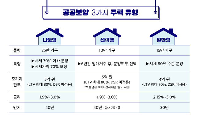 올 연말부터 사전청약을 받기 시작한다는데요, 다만, 나눔형과 선택형에서 지원되는 전용 모기지의 조건은 현재 디딤돌 대출금리 등을 전제로 산정된 것으로 지원 시점 상황에 따라 일부 변동될 수 있대요.