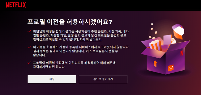 반면, OTT 시장에서 독보적인 1위를 달리고 있는 넷플릭스는 최근 국내에 👤’프로필 이전‘ 기능을 도입했는데요, ‘프로필 이전’은 새 계정을 만들 때 넷플릭스 이용 내역과 설정을 그대로 유지할 수 있는 기능으로, 개인 프로필에 저장되어 있는 시청 기록, 맞춤형 추천 콘텐츠 등을 그대로 새 계정으로 옮길 수 있다고 해요. 다만, 결제 정보는 이동할 수 없대요. 본 계정 소유자가 ‘프로필 이전’ 기능을 허용하면, 2일 후 자동으로 프로필 이전 기능이 활성화되고요. 이후 새로운 계정으로 넷플릭스에 접속해 개인 프로필을 이전할 수 있다고 해요.