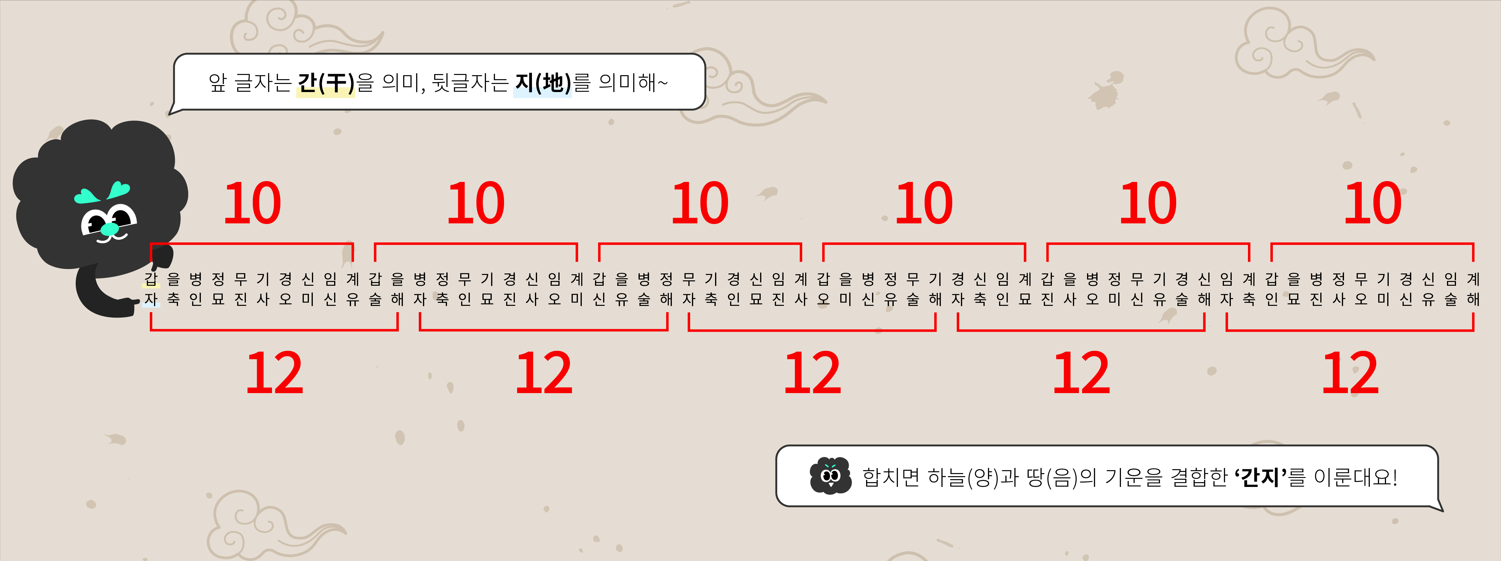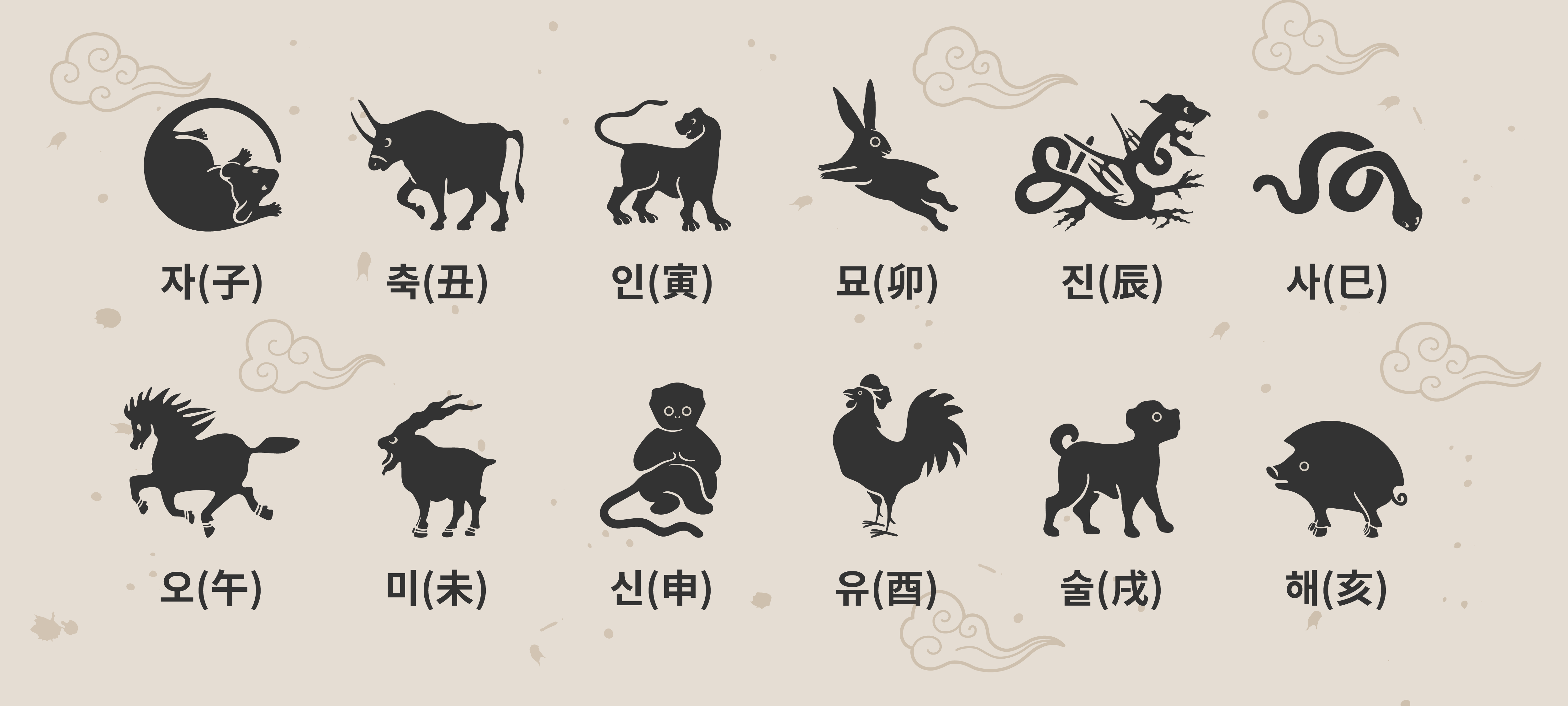간지 중 뒷글자를 담당하고 있는 십이지는 12종류의 동물로 나타내요. 쥐띠, 소띠와 같이 표현하는 우리의 띠도 여기에서 오는 거랍니다!