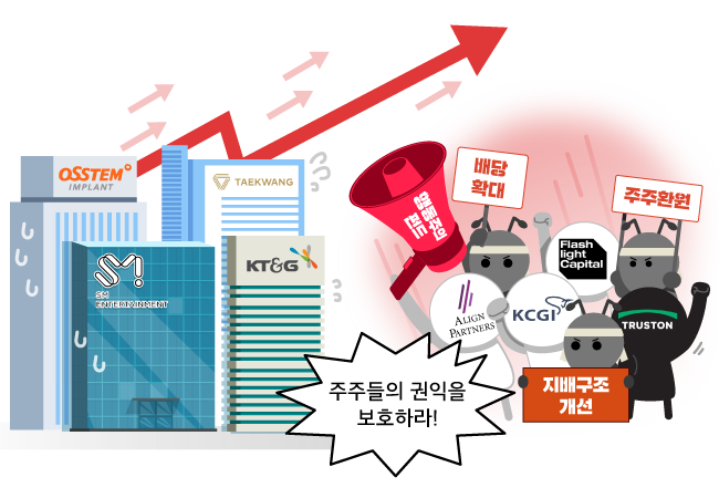 최근 국내 행동주의 펀드들이 주주행동에 나서거나 활동 대상이 된 국내 기업들이 늘고 있어요. 회사는 좋은데 후진적 지배구조 등으로 주가가 제값을 받지 못하고 있다는 거죠. 그리고 행동주의 펀드가 나서면 기업가치 제고와 배당 확대에 대한 기대감으로 해당 기업의 주가가📈 오르기도 했는데요. 대표적으로 SM, 오스템임플란트, KT&G 등이 있어요.