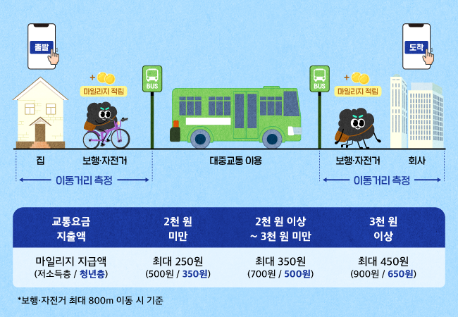1회당 적립이 가능한 최대거리는 800m인데요. 800m를 도보와 자전거로 이동했을 때 교통비가 2천 원 미만은 최대 250원, 2천 원~3천 원 미만은 최대 350원, 3천 원 이상은 최대 450원을 마일리지로 적립해줘요. 최대 20%가 할인되는 거죠. 이때 저소득층과 청년층(만 19~34세)은 마일리지 적립 금액이 더 ↗️커요. (3월부터는 저소득층의 마일리지 적립액이 기존 500~900원에서 700~1,100원으로 확대 예정!) 만약 이동 거리가 800m 미만이라면 거리에 비례해 지급돼요.