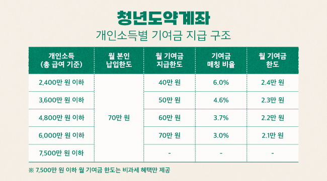 정부는 소득이 낮을수록 기여금 지원 폭을 키우고, 저소득청년에게는 우대금리 혜택까지 지원할 것이라고 밝혔는데요. 청년도약계좌는 총급여가 6,000만 원 이하일 경우 정부 기여금과 비과세 혜택을 모두 받을 수 있도록 설계됐어요. 총급여가 6,000~7,500만 원일 경우엔 비과세 혜택만 적용된다고 해요. 기여금 지원은 총급여가 4,800만 원 이하인 경우에는 월 납입금액이 70만 원에 못 미치더라도 정부 기여금을 모두 수령할 수 있고요. 개인소득이 낮을수록 많은 지원이 이뤄질 수 있도록 지원금 지급한도도 📊소득 구간별로 차등을 두었는데요. 예로 총급여 2,400만 원인 청년이 40만 원만 납입해도 기여금 6%까지 받을 수 있고요. 4,800~6,000만 원 이하인 청년은 70만 원을 계좌에 넣어야 3%를 받게 되는 거예요.