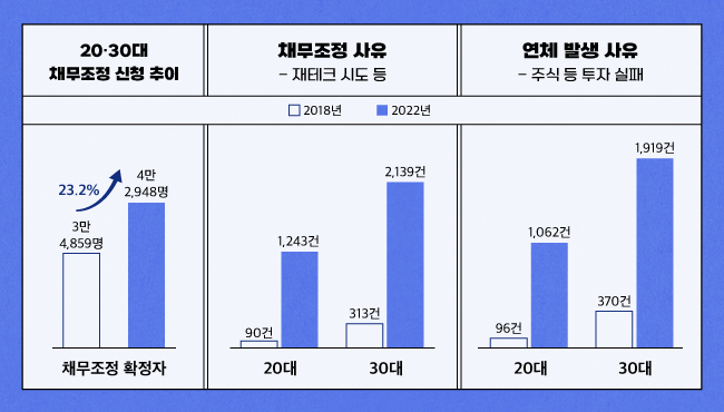 한편, 이미 빚내서 투자했다가 실패해 빚을 탕감받은 2030세대 규모가 급격하게 ↗️늘었대요. 지난 15일, 오기형 더불어민주당 의원실이 신용회복위원회로부터 제출받은 ‘최근 5년간 채무조정 현황’📊 자료에 따르면, 20·30대 채무조정 확정자 수는 지난해 4만 2,948명으로 2018년보다 23.2% 증가했어요. 특히 채무조정 신청자들이 빚을 내게 된 사유 중 ‘재테크 시도’ 비중이 급격하게 늘어났다는데요. 2018년 20대의 채무조정 신청 사유 중 ‘재테크 시도’는 90건에 불과했지만, 지난해에는 1,243건으로 무려 14배 가까이 증가했어요. 같은 기간 30대 역시 7배 이상 늘었다고. 그리고 투자 실패로 빚을 갚지 못한 연체도 늘었는데요. 20대와 30대의 연체 발생 사유로 ‘주식 등 투자 실패’인 경우가 2018년 각 96건, 370건에서 지난해 1,062건, 1,919건으로 급등했어요.