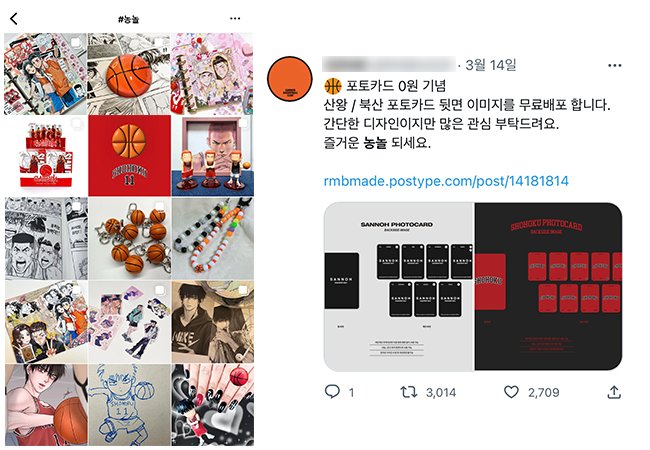 그러니까 굿즈를 구매하고, 좋아하는 캐릭터의 팬아트를 그리는 등 덕질 활동부터 꼭 슬램덩크가 아니더라도 농구 관련 콘텐츠를 즐기는 모습까지 농놀이라고 표현하며 각종 SNS에 🤳인증하고 있다는 건데요. 실제로 지난 1월에 열렸던 팝업 스토어에서도 대기 행렬이 이어지며, 하루 평균 약 1억 원의 매출이 발생했고요. 이후 중고 거래 앱에서 웃돈을 붙여 되파는 리셀 현상도 나타났어요.😵 또 이제는 유통 업계에서도 농놀에 주목하기 시작! 세븐일레븐에서 롯데칠성음료와 손을 잡고 슬램덩크 와인을 출시하기도 했어요. (그런지 사원 : 다음 달에는 슬램덩크 페스티벌도 열린다고 하니, 농놀하기 정말 좋겠네! 정말 좋겠어!)