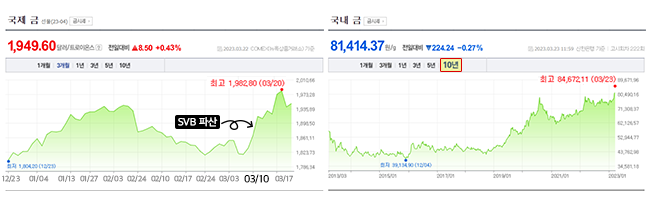 2월 말까지만 해도 금값은 1천800달러에 머물렀는데요. 이달 초 미국 실리콘밸리은행(SVB) 파산을 시작으로 스위스 크레디트스위스(CS)까지 유동성 🚨위기가 불거지면서 글로벌 은행 위기에 대한 😱공포로 안전자산인 금으로 돈이 몰린 거라고 해요. 스위스 최대 금융회사 UBS가 CS를 인수하면서 금융 붕괴 위기는 넘겼지만, 투자자들은 여전히 은행 위기가 끝난 게 아니라고 판단해 금 매수에 나서고 있대요.