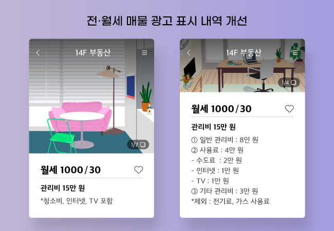 정부는 플랫폼 업계와 협의해 온라인 중개 플랫폼에 ‘관리비 세부 입력 기능’을 다음 달 중 즉시 시행할 수 있도록 추진한다고 해요. 또한 10만 원 이상 정액 관리비에 대한 중개대상물 표시·광고 의무화는 오는 9월 중, 중개대상물 확인·설명 의무화는 12월 중 법 개정을 통해 시행할 계획이래요. 이번 대책으로 과도하게 관리비가 부과되는 일이 사라졌으면 좋겠네요.