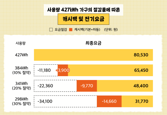 캐시백에 따른 효과를 제대로 누리려면 최소 10% 이상 절약하는 것이 중요해요! 예를 들어, 여름철에 월 427㎾h를 사용하는 4인 가구가 에너지캐시백 가입 후 사용량을 10%(43㎾h) 줄였다고 해볼게요. 절약한 만큼 요금이 1만 1180원이 줄었고요. 여기에 캐시백 3900원이 차감되면서 최종 전기요금은 6만 5450원으로, 1만 5080원의 요금을 절약할 수 있게 된 거예요. 지난해(6만 6690원)와 비교해도 약 1천 원을 덜 내게 되는 거죠. 만약 캐시백 최대 지급 한도인 30%까지 절감하는 데 성공하면 3만 1770원만 부담하면 돼요.