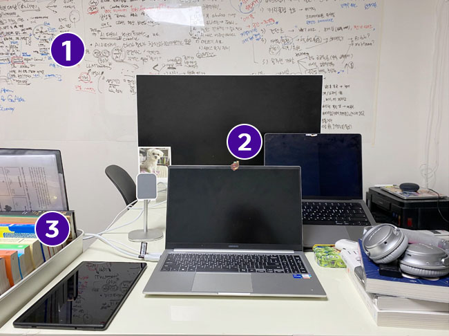 ① 떠오르는 아이디어를 마구 작성해두는 투명 보드