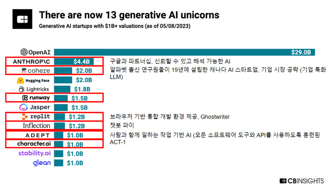 네, 아래에 빨간색으로 표기한 게 올해 5월에 Gen AI 기업들 중에서 유니콘으로 성장한 기업들을 추린 거예요.