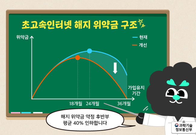 과기부는 이런 문제를 개선하기 위해 통신 4사와 위약금 개선안을 협의해왔고요. 소비자단체, 전문가, 사업자 등이 참여하는 ‘통신서비스 제도개선자문위원회’ 논의 등을 거쳐서 이용자의 가입유지 기간에 대한 기여분을 높이는 방식으로 위약금 구조를 개선했는데요. 위약금이 약정기간 절반(18개월)이 지난 시점부터 감소해 만료 시점(36개월)에 0원으로 하락하는 종형 구조로 변경했어요.