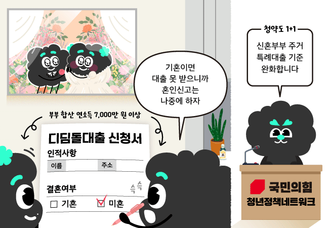 이런 위장 미혼을 없애기 위해 국민의힘은 정부와 함께 ‘신혼부부 주거 안정 대책’을 추진한다는데요. 지난 11일, 국민의힘 청년정책 총괄 기구인 청년정책네트워크 특별위원회는 신혼부부의 주택자금 특례대출 소득 기준을 완화하고, 청약 기회도 확대하는 내용의 ‘결혼 페널티 정상화’를 발표했어요.📢