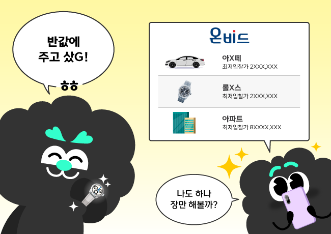 이번에 4천만 원짜리 시계⌚를 반값에 샀다며 자랑하는 알지 과장~! 아니 저것은 롤X스?! 짝퉁 아닌 정품이라고요?! 알지 과장이 명품시계를 장만한 곳은 공매 포털 사이트 ‘온비드’라고 하는데요, 최근 알짜 물건을 싸게 구매하는 공매 재테크가 인기래요.💰