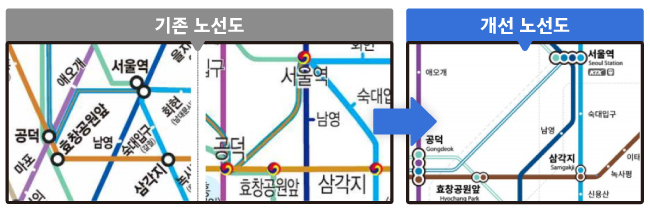 ✅ 개선된 노선도는 약자를 배려해 노선의 색상과 패턴을 새롭게 적용했어요.