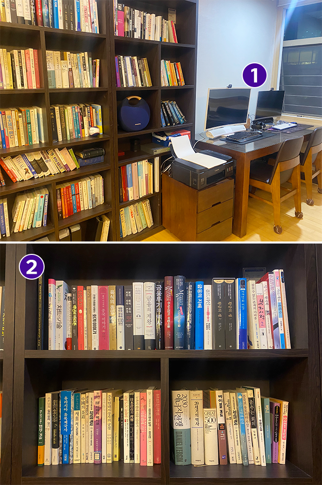 ① 주로 작업하는 거실 서재의 책상, ② 시장이 고민될 때 예전에 읽었던 책을 꺼내보며 영감을 얻는다며 요즘은 전자책을 많이 보지만 꼭 소장하고 싶으면 사서 꽂아두는 편이라고.