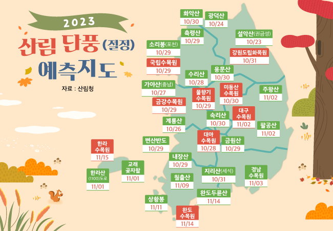 ✅ 산림청이 ‘2023년도 가을 단풍 예측지도’를 공개했어요.