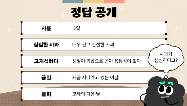 사원님! 오늘은 577번째 한글날이에요. 한글날은 세종대왕이 창제한 훈민정음(訓民正音)을 세상에 펴낸 것을 기념하고, 우리 한글의 우수성을 기리기 위해 제정한 국경일인데요. 한글은 세계에서 유일하게 만든 사람과 반포일을 알며, 글자를 만든 원리까지 아는 아주 신비로운 문자로 인정받고 있다고 해요.👏 한글 덕분에 우리나라 문맹률은 1% 이하로 세계 최저 수준을 자랑하는데요. 그런데 누구나 글을 읽을 수는 있지만 최근 들어 글을 읽고 이해하는 능력인 ‘문해력’이 떨어지고 있다는 지적이 나오고 있어요. 지금부터 우리 사원님들의 문해력은 어느 수준인지 잠깐 퀴즈 타임을 가져보려고 하는데요. ‘사흘, 심심한 사과, 고지식하다, 금일, 글피’ 이 단어들의 알맞은 뜻은 무엇일까요?