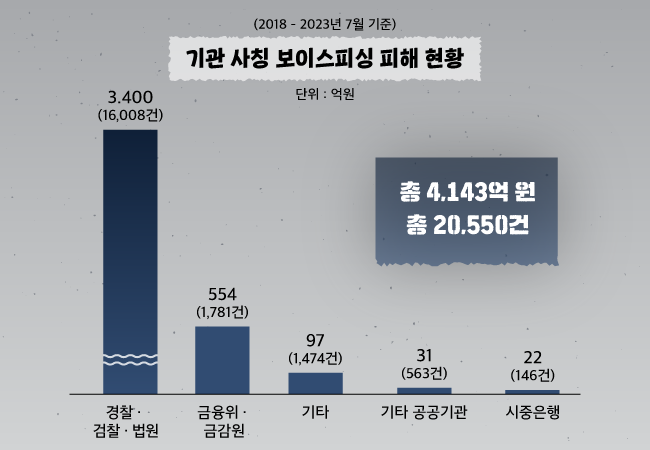 사원님! 보이스피싱 전화 받아보신 적 있으시죠? 예전에는 주로 자식이나 지인을 사칭하는 보이스피싱이 많았는데요. 최근에는 👮경찰이나 정부 기관 등을 사칭하는 사례가 증가하고 있어요. 국회 정무위원회 소속 강민국 의원(국민의힘)이 금융감독원에서 제출받은 자료에 따르면 지난 2018년부터 올해 7월까지 발생한 기관 사칭형 보이스피싱은 2만 550건으로 피해액 규모는 4,143억 원이었는데요. 2021년 912건(171억 원), 2022년 1,310건(213억 원) 규모에서 올해에만 2,506건(343억 원)의 사칭형 보이스피싱이 발생한 것을 고려하면 증가세도 뚜렷한 상황이에요.