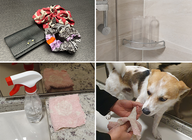 (좌측 상단부터 시계방향) 스카프와 고무장갑으로 만든 스크런치와 안 쓰는 가방을 잘라 만든 카드지갑, 냉수에서 온수로 바꿀 때 흘려보내는 냉수를 받기 위한 물받이 통, 강아지 미키 산책 후 물티슈 대신 물과 안 쓰는 천으로 발 닦기
