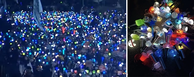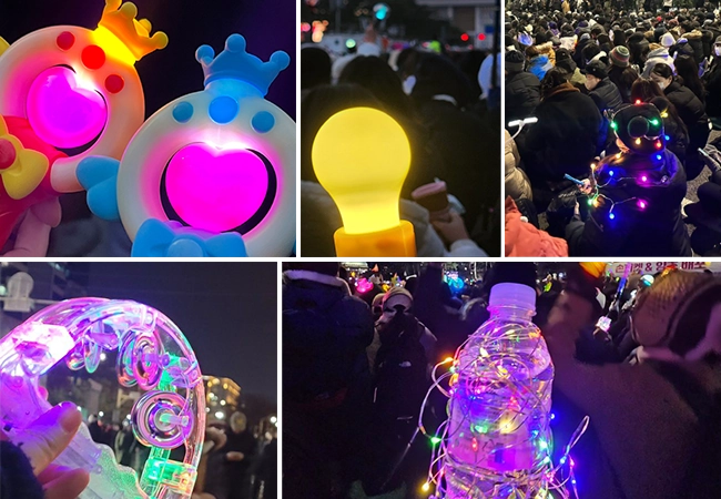 사실 집회에 등장한 건 응원봉만이 아니었는데요. 빛이 나는 것이면 무엇이든! 가능했어요. 특히 다이소 제품을 다양하게 활용한 모습을 볼 수 있었는데요. 응원봉 대신 프린세스 요술봉과 LED 탬버린을 사용하기도 하고요. 걸이형 아크릴 LED와 캠핑등, 교통정리할 때 쓰는 LED 안전 신호봉을 이용하기도 했죠.🔦 또 응원봉이 없어서 생수병에 LED 조명을 두르기도 했는데요. 심지어 몸에 직접 LED 조명을 두른 시민들도 있었다고!