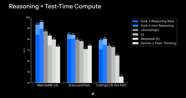 또한 xAI에 따르면, 그록 3은 수학(AIME 2024), 과학(GPQA), 코딩(LCB Oct-Feb)을 통해 논리적 추론 및 문제 해결 능력을 평가하는 Benchmarks 테스트에서도 ‘GPT-4o’, ‘제미나이 2.0’, 엔트로픽의 ‘클로드 3.5 소네트’, 딥시크의 ‘V3’ 같은 경쟁 모델보다 높은 성과를 보여 전 항목에서 1위를 했다고 전했어요. 다만, 이번 비교 군에는 GPT의 가장 고급 추론 모델인 ‘GPT-o3’은 들어있지 않았기 때문에 그록3이 챗GPT의 모든 모델을 압도했다고 볼 순 없다는 의견도 있어요.