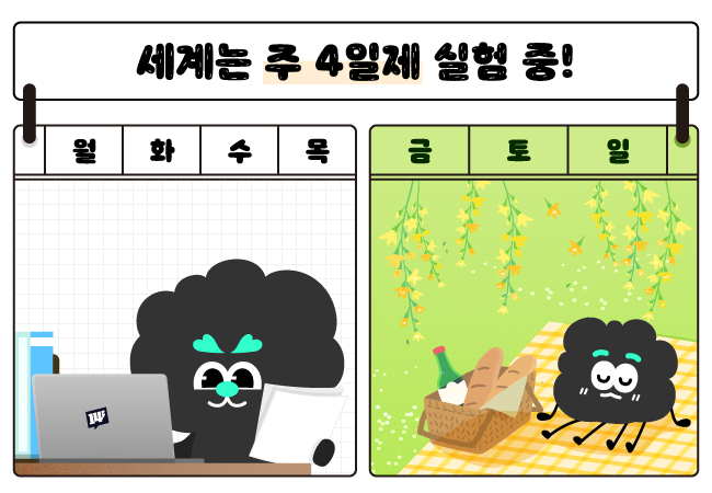 주 4일 근무제로 유명한 나라는 아이슬란드예요. 아이슬란드 중앙 정부와 수도 레이캬비크 시의회는  2015년부터 2019년까지 근로자  2500명 이상을 대상으로 주 4일 근무제의 효과를 실험했어요. 실험 결과는 스트레스😓와 번아웃🔥 현상은 줄고 업무 생산성은 오히려 늘어났다고 하고요.