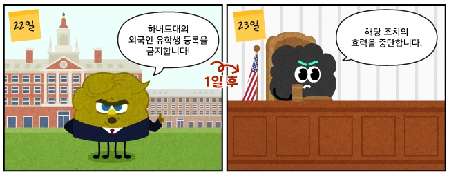 하버드대의 가처분 신청은 빠르게 법원 판단으로 이어졌는데요. 하버드대가 소장을 제출한 지 몇 시간 만에 법원은 해당 조치의 효력을 중단시켰어요.💥 미 매사추세츠 연방법원 판사는 하버드가 즉각적이고 회복 불가능한 손해를 입게 될 것이라는 점을 충분히 입증했다고 밝혔는데요. 이에 따라 하버드대의 외국인 유학생과 연구자 7천여 명의 체류 자격 유지는 물론, 신입생의 등록이 가능해졌어요. 다만 해당 조치에 대한 본안 소송이 아직 남아 있는데요. 앞으로 트럼프 행정부와 하버드대 간의 법적 공방이 치열하게 이어질 것으로 보여요.