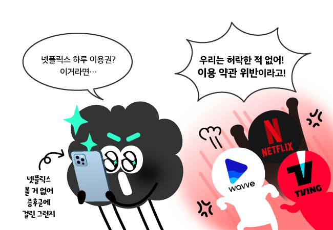 사원님들, ‘넷플릭스 증후군’이라고 들어보셨나요? 넷플릭스에 막상 들어가면 볼 게 없어서 고민만 하다가 하루가 다 간다는 건데요. 생각보다 이 증후군 앓고 있는 사람들이 많더라고요. (그게 바로 접니다✋) 어떨 때는 💸매달 나가는 돈이 아까워서 보고 싶은 거 생길 때만 구독하고 싶다!🥺 이런 생각도 든다고 하고요. 그런데 그것이 실제로 일어났습니다? 최근, OTT 1일 이용권을 판매하는 사이트가 생겨 논란이 되고 있대요!