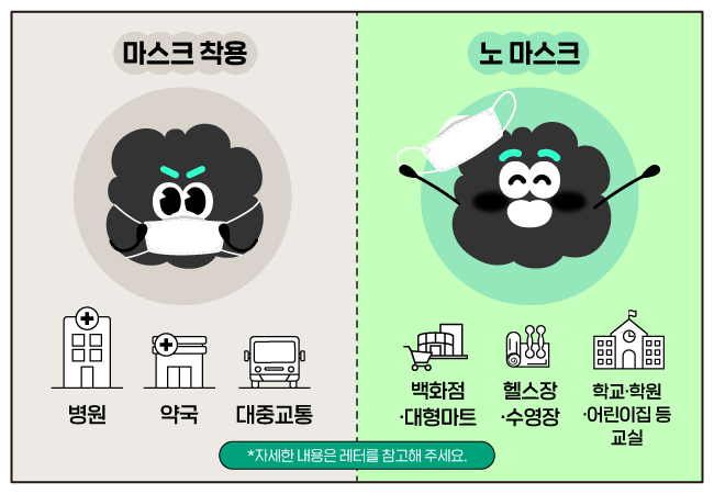 오늘부터는 헬스장이나 🏊수영장에서 마스크를 쓰지 않아도 되고요. 어르신들과 아이들이 모이는 경로당, 🏫학교, 유치원, 어린이집 등에서도 마스크를 쓰지 않아도 돼요. 그런데 모든 곳에서 마스크를 벗을 수 있는 건 아니에요. 마스크를 꼭 착용해야 하는 곳이 있는데요. 🏣의료기관과 약국, 감염취약시설, 대중교통 등에서는 실내 마스크 착용 의무가 유지되고요. 따라서 해당 기관 내 헬스장·탈의실에서도 마스크를 써야 해요. 그러나 병원의 1인 병실은 과태료 부과 예외 대상이라서 마스크를 벗어도 된다고! 또 백화점이나 쇼핑몰, 대형마트에서는 마스크를 쓰지 않아도 되지만, 그 안에 있는 약국에서는 마스크를 꼭 착용해야 하고요. 학교와 유치원, 어린이집은 마스크 착용 의무가 없지만, 통학 차량은 🚍대중교통에 해당하기 때문에 마스크를 써야 해요. 이외에도 지자체별로 실내 마스크 착용 의무 시설이 다를 수 있으니 꼭 확인해 주세요!